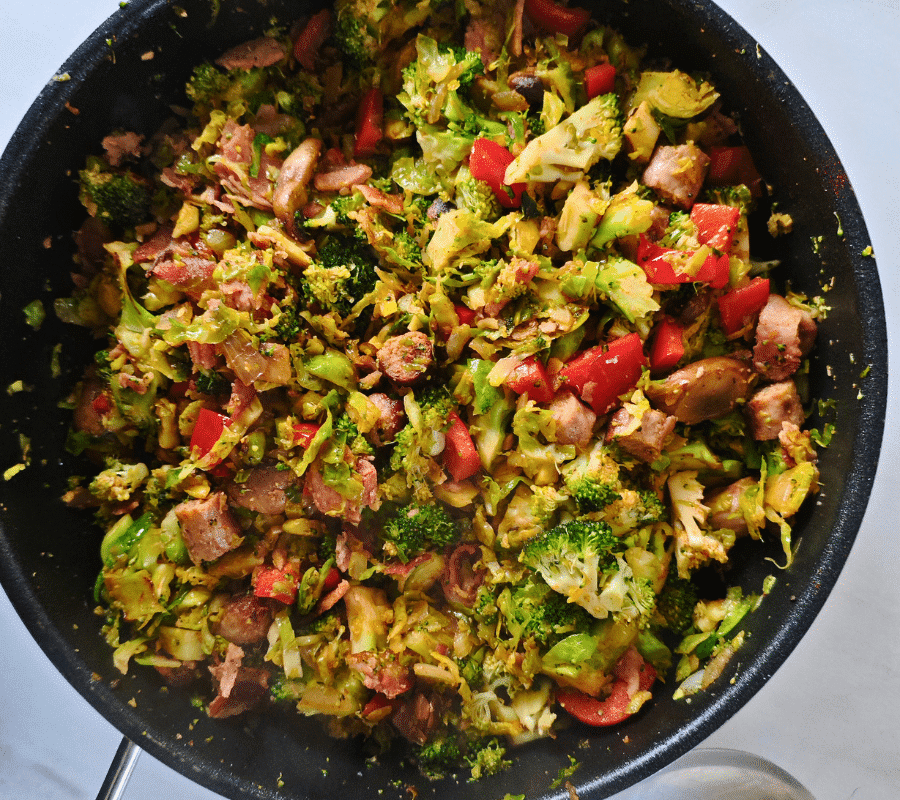 - Add the chopped Brussel sprouts, broccoli, pepper, paprika and cayenne pepper. Cook for about 4 -5 minutes then add the sausage and bacon. Stir for 1 minute then serve.